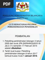 Dalam perbentangan bajet 2018 pada bulan oktober tahun lalu, satu pekeliling berkenaan cuti rehat khas (crk) telah diluluskan berkuatkuasa pada tahun 2018. Pekeliling ini berkuatkuasa pada 1 januari 2018. Penambahbaikan 81 skim perkhidmatan (36). Bermula 1 januari 2018, kerajaan memutuskan cuti yang dikumpulkan bagi maksud ganjaran wang tunai melebihi 150 hari, maka cuti berkenaan boleh dimohon untuk digunakan pada tahun persaraan. Ia diberi kepada pegawai perkhidmatan pendidikan untuk menggantikan cuti sambilan.